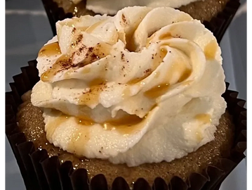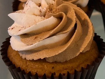 "Seasonal Flavor" Pumpkin spice cake topped with swirled espresso and vanilla frosting and a sprinkle of cinnamon.